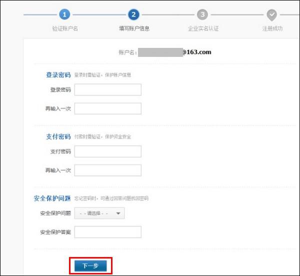 2、点击【企业账户】,填入电子邮箱和验证码(公司账户只能邮箱注册),点击【下一步】;