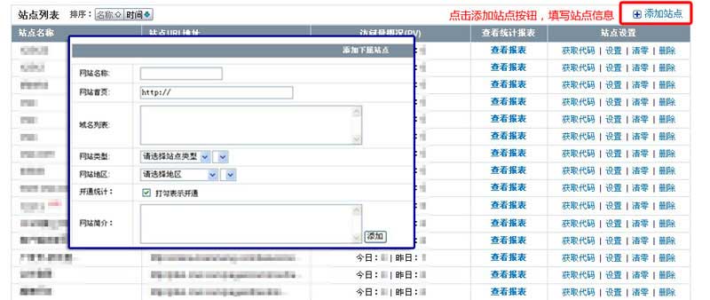 在站点列表页点击“添加站点”按钮,填写您的站点名称、域名、网站类型、地区、简介等信息,勾选开通统计,即完成添加站点