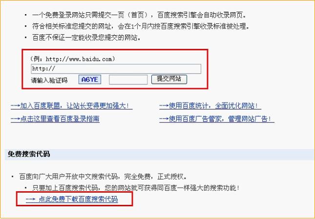 第三:重复第二步骤,然后在“网站登录”的下方,有一个“点此免费加入搜索代码”:[url]<a href="http://www.baidu.com/search/code.html" target="_blank">http://www.baidu.com/search/code.html</a>[/url]