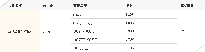 阶梯费率算法示例:如您的交易量为12万,则您的费用为6万*1.2%+(12万-6万)*1.0%=0.132万元。