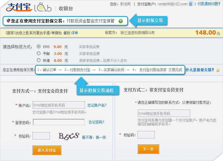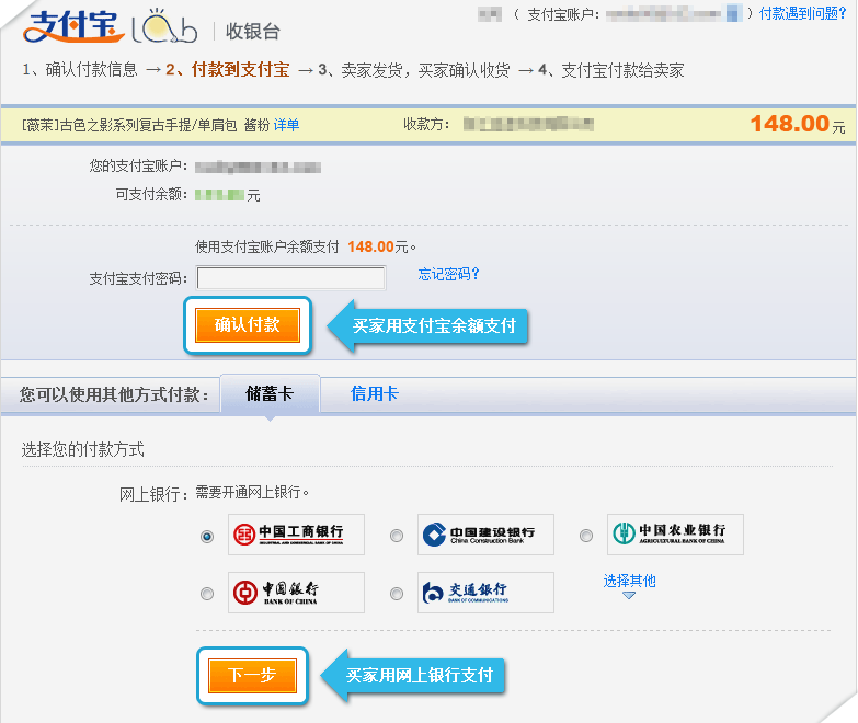 淘宝买家最熟悉的付款方式:买家先将交易资金存入支付宝并通知卖家发货,买家确认收货后资金自动进入卖家支付宝账户,完成交易。