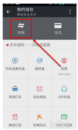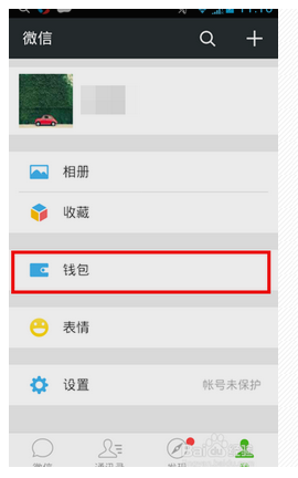 进入微信切换顶端的选项至“我”,点击“钱包”。