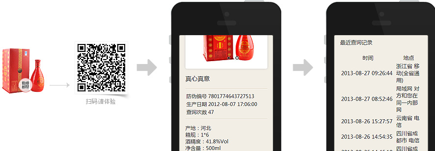 或粘贴在商品包装上,用二维码识读器扫描产品上的二维码即可查看产品真伪信息和溯源, 同时了解更多产品和企业信息,形成互动营销和数据统计。