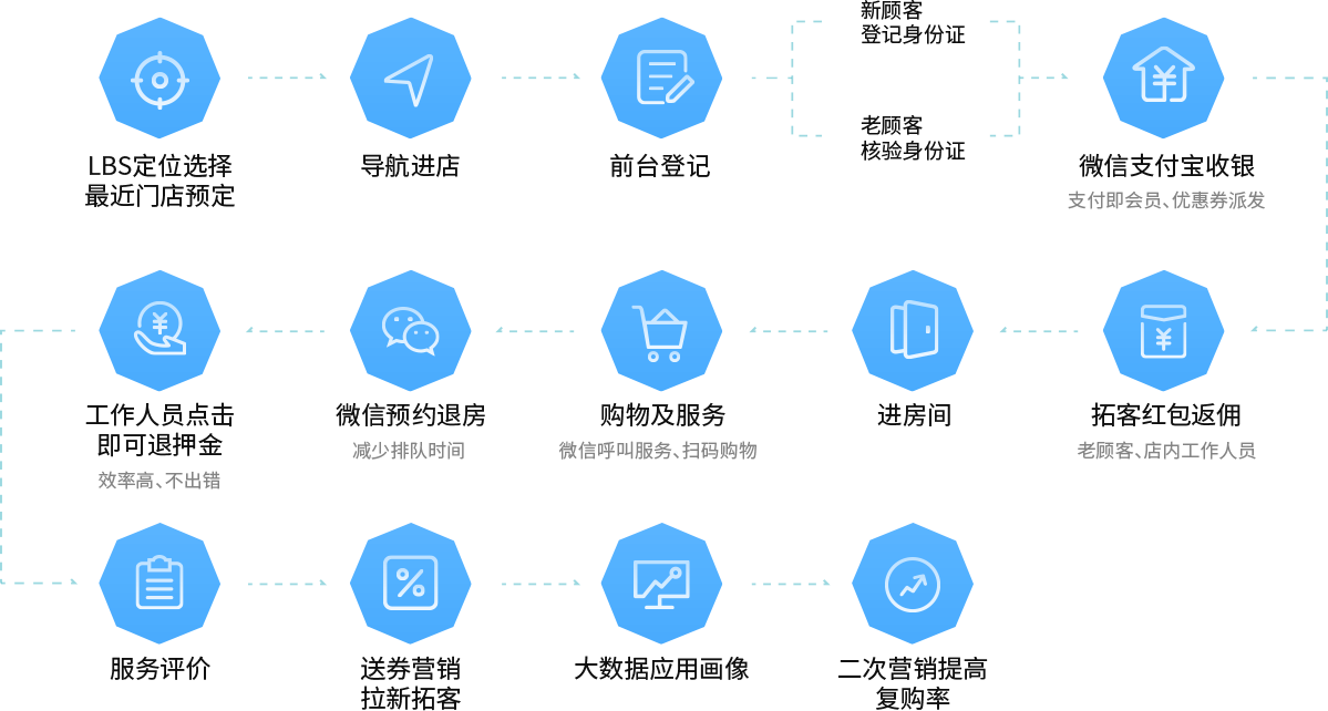 预定、老顾客入驻办理可免登记、退房微信预约、微信退押金等功能可以极大的减少顾客排队时间