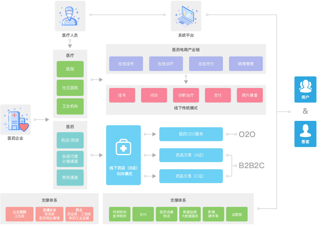 医药主要有B2B和B2B2C两种运营模式,其中B2B主要分为政府主导的B2B采购平台和药企B2B(如:药企与医院、门店相互进行的处方类药物交易平台)和以自营+入驻的B2B2C模式,可面向个人消费者进行销售的平台。