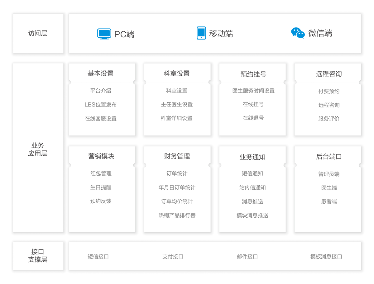 云医院所有的产品都基于不同的业务场景提供应用化服务,具有灵活配置和快速升级特点。