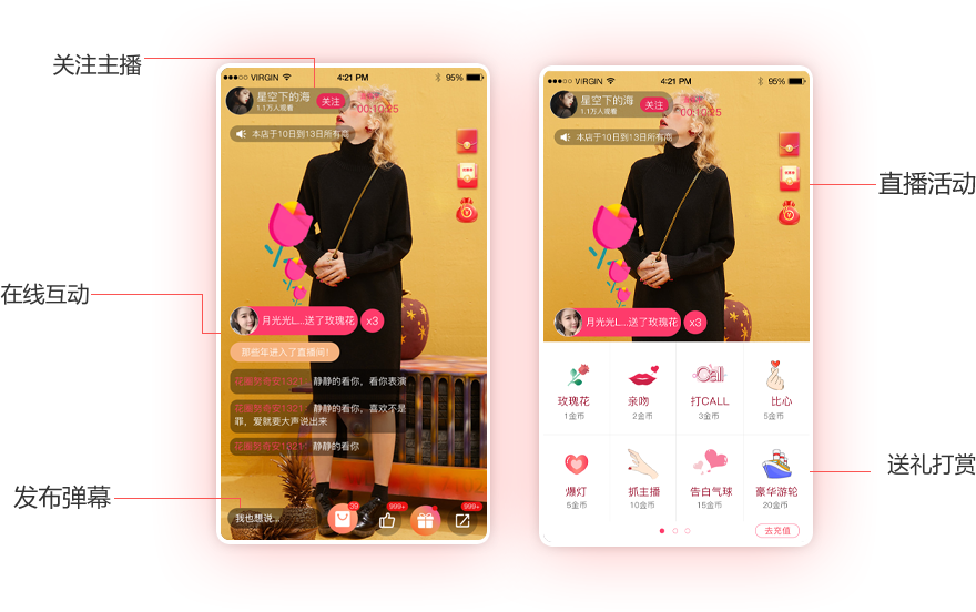 大转盘抽奖、投票、红包、打赏、礼物、问卷、签到、公聊、